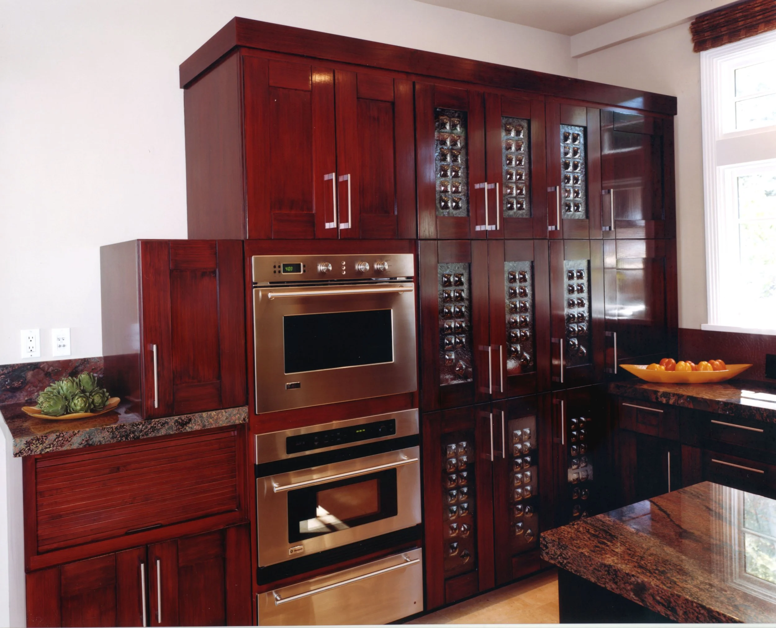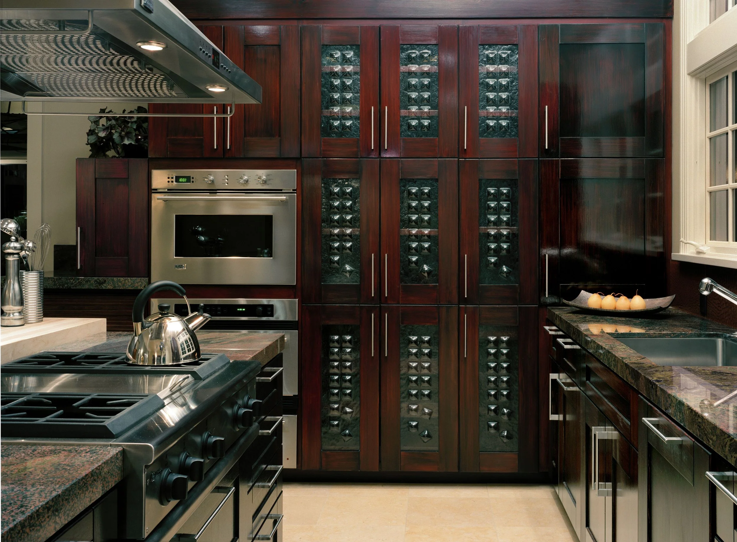 A modern kitchen with dark wood cabinetry, stainless steel appliances, and a black and green granite countertop. A stainless steel oven and stove, a kettle on the stove, and a wine storage cabinet built into the cabinet wall.