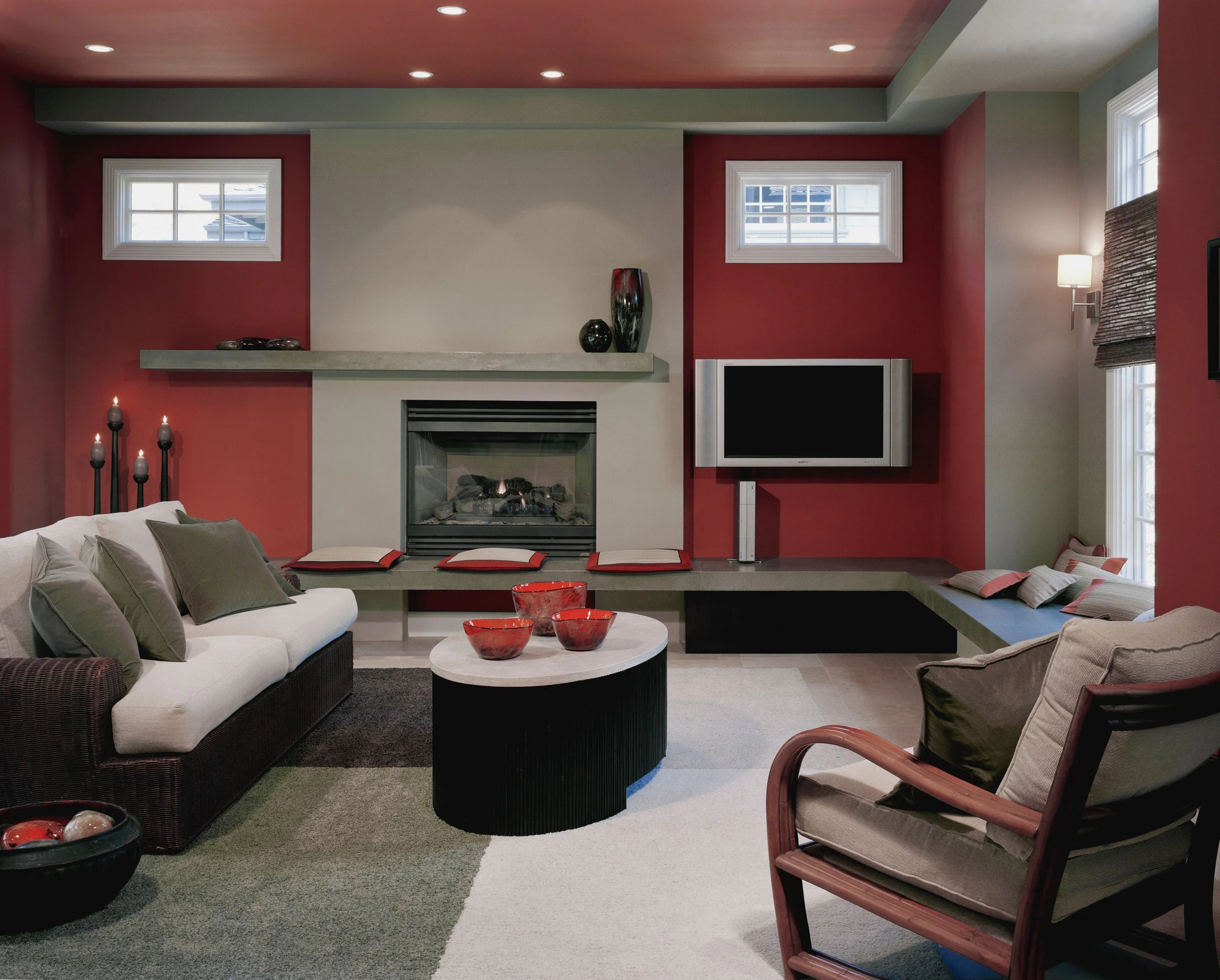Living room with red and beige walls, fireplace, wall-mounted TV, windows, and furniture including a beige sofa with green pillows, a wooden chair with beige cushions, and a black and white coffee table with red bowls.