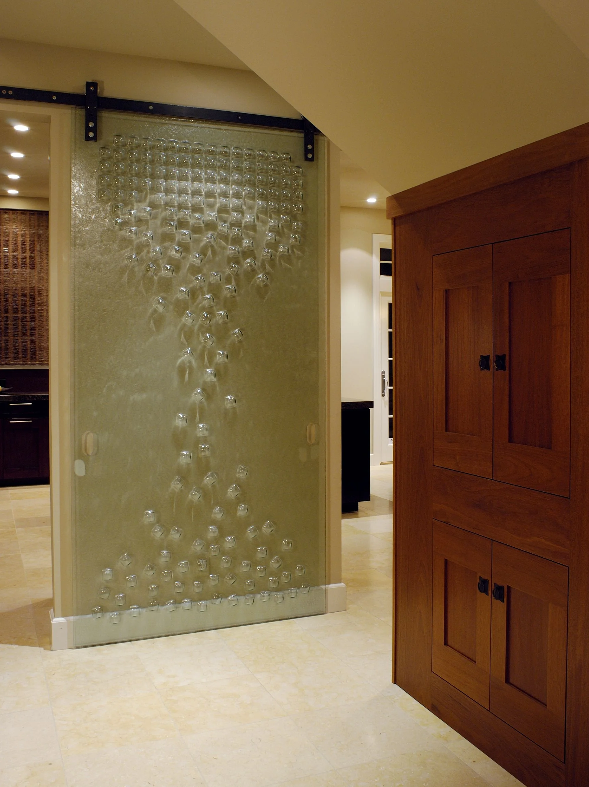 A glass sliding door with a decorative pattern made of small glass blocks, next to a wooden cabinet in an interior setting.
