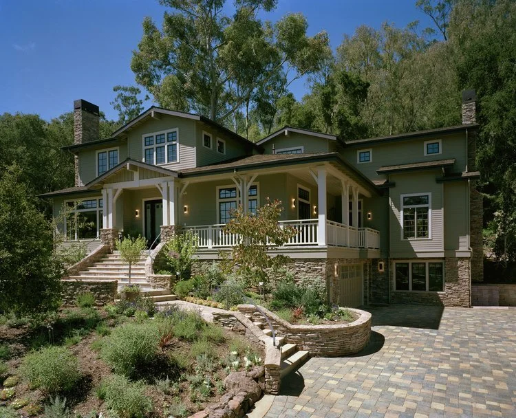Large green multi-story house with a porch, surrounded by trees and landscaped garden with stone steps and a paved driveway.