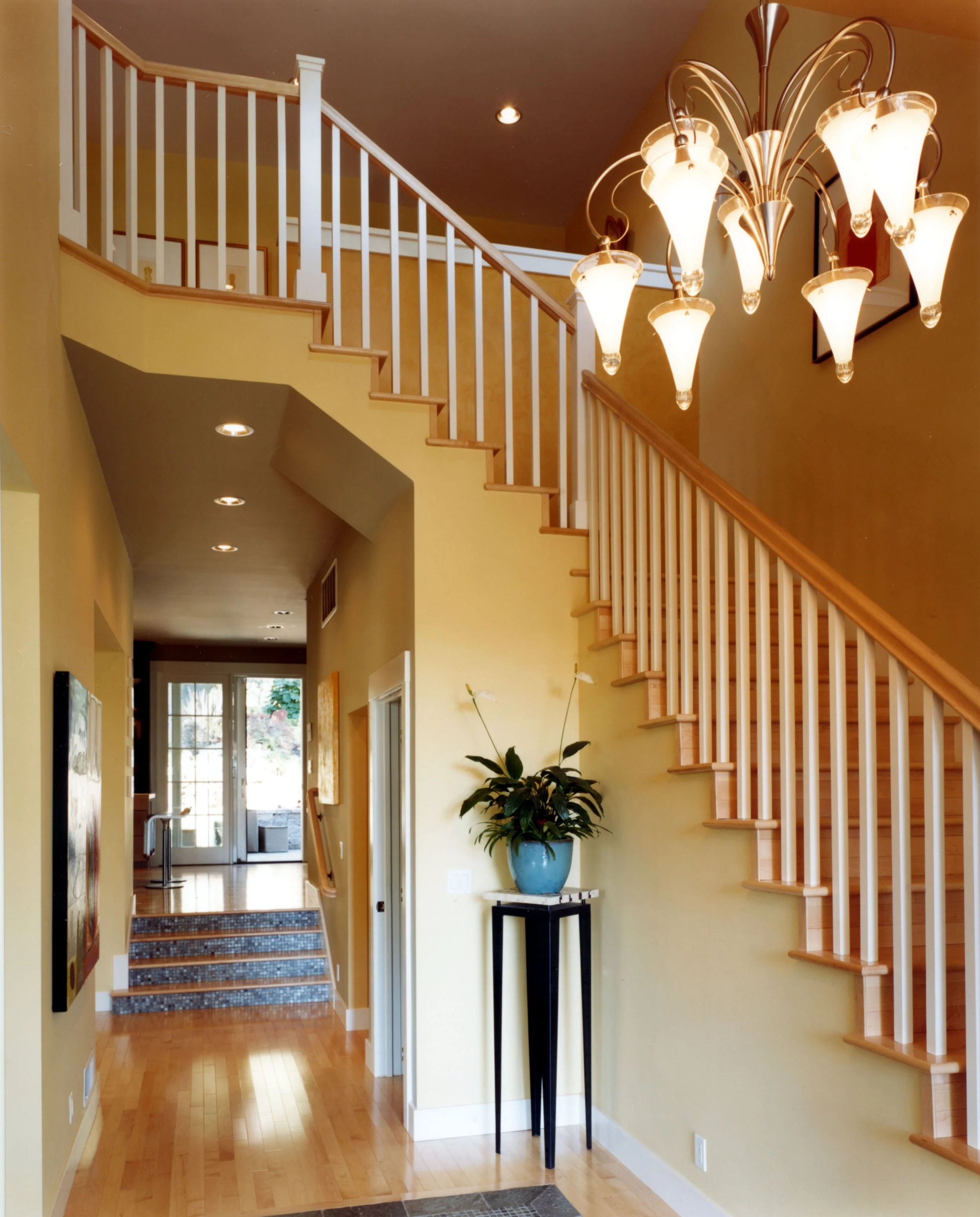 Interior view of a house entryway with a staircase, a chandelier with multiple glass shades, a potted plant on a tall black stand, and hardwood floors.