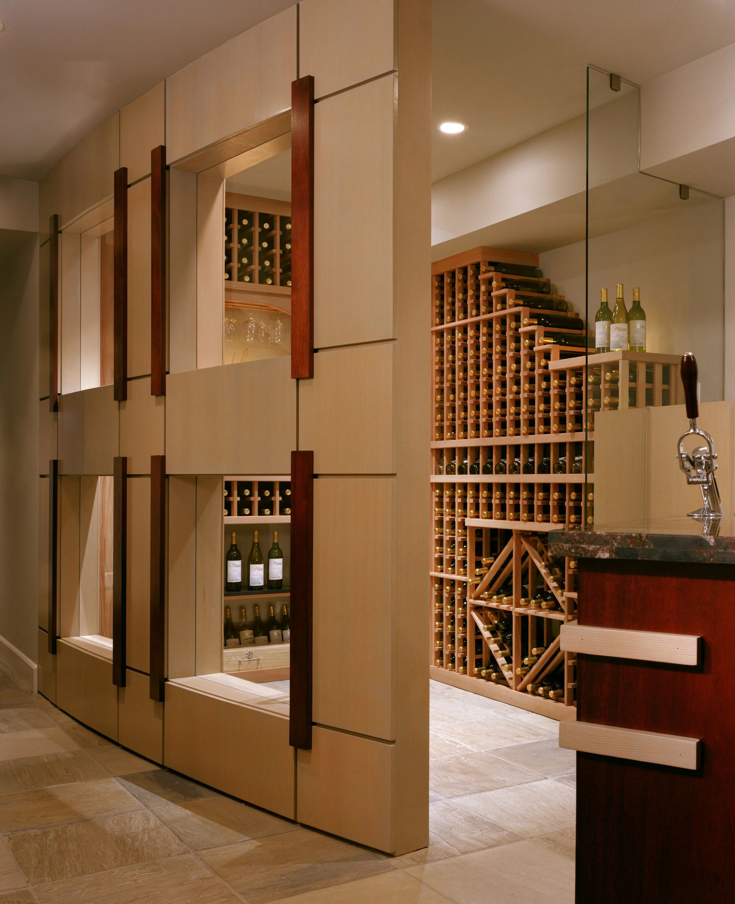 A wine cellar with wooden racks filled with wine bottles and glasses, a countertop with a wine opener, and a modern interior design.