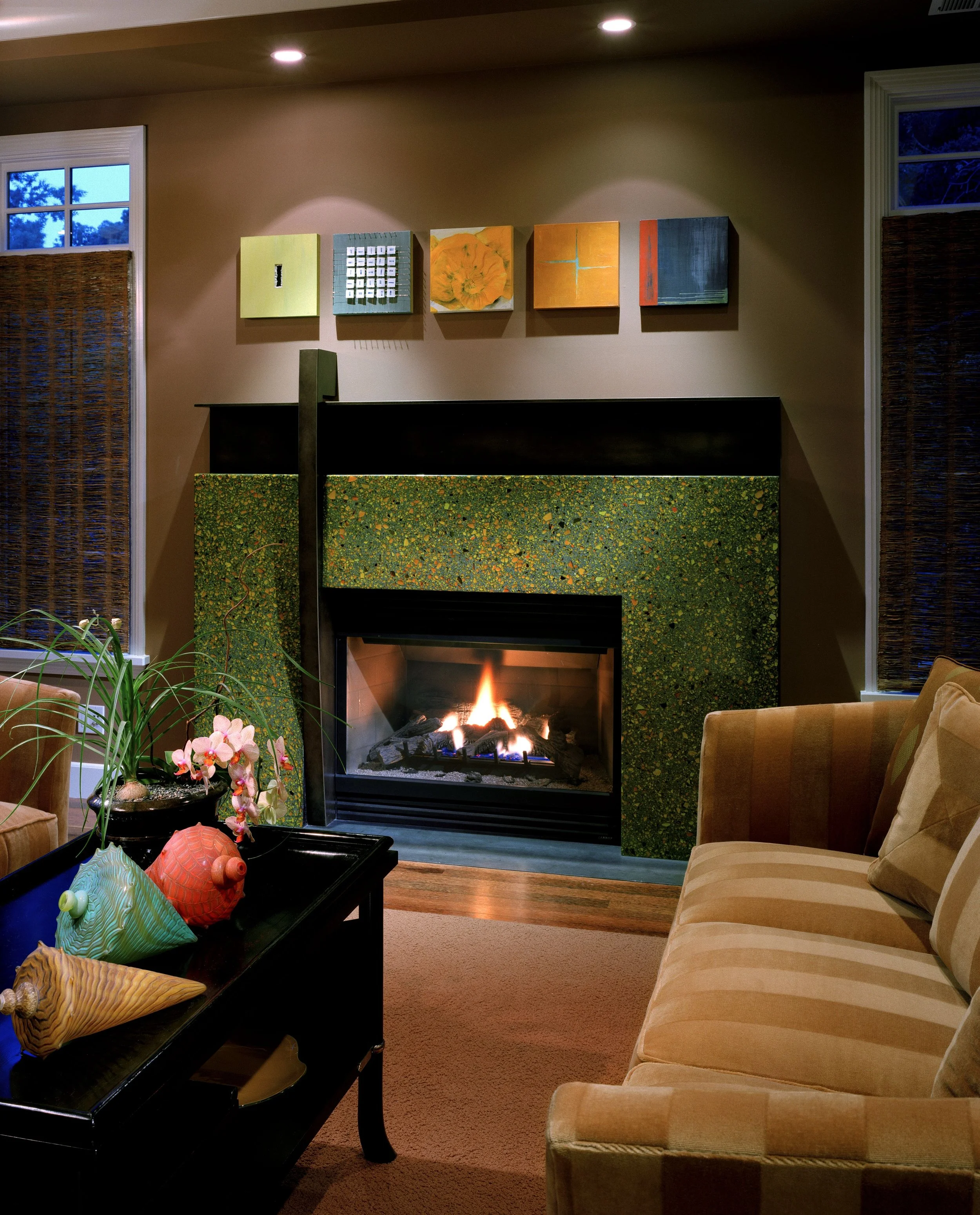 Cozy living room with a gas fireplace, colorful abstract artwork above the mantel, beige striped sofa, and a coffee table with decorative sea shell-shaped containers and a plant.