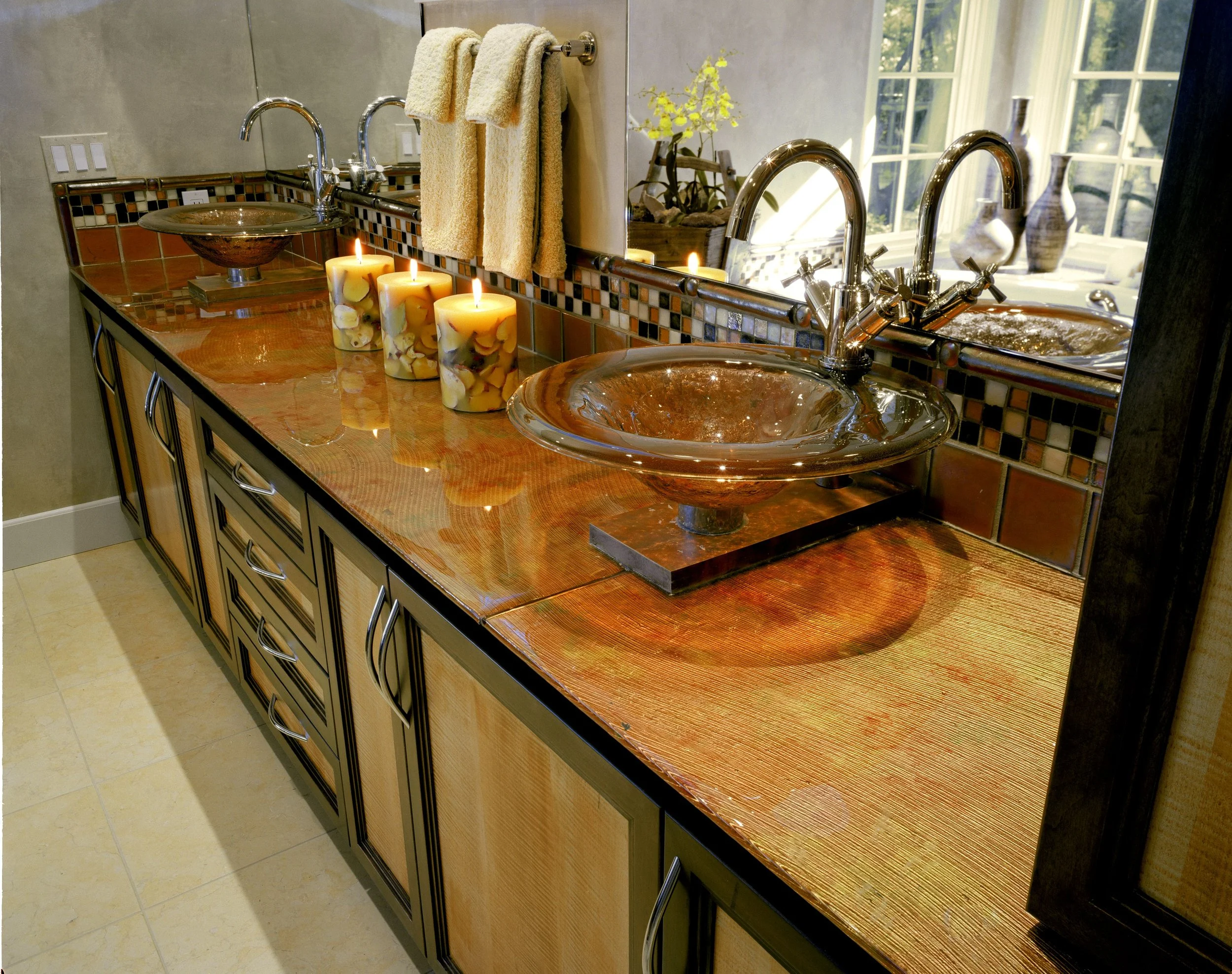 Bathroom vanity with wooden countertop, two copper vessel sinks, mirrors, lit candles, towels, and two faucets.