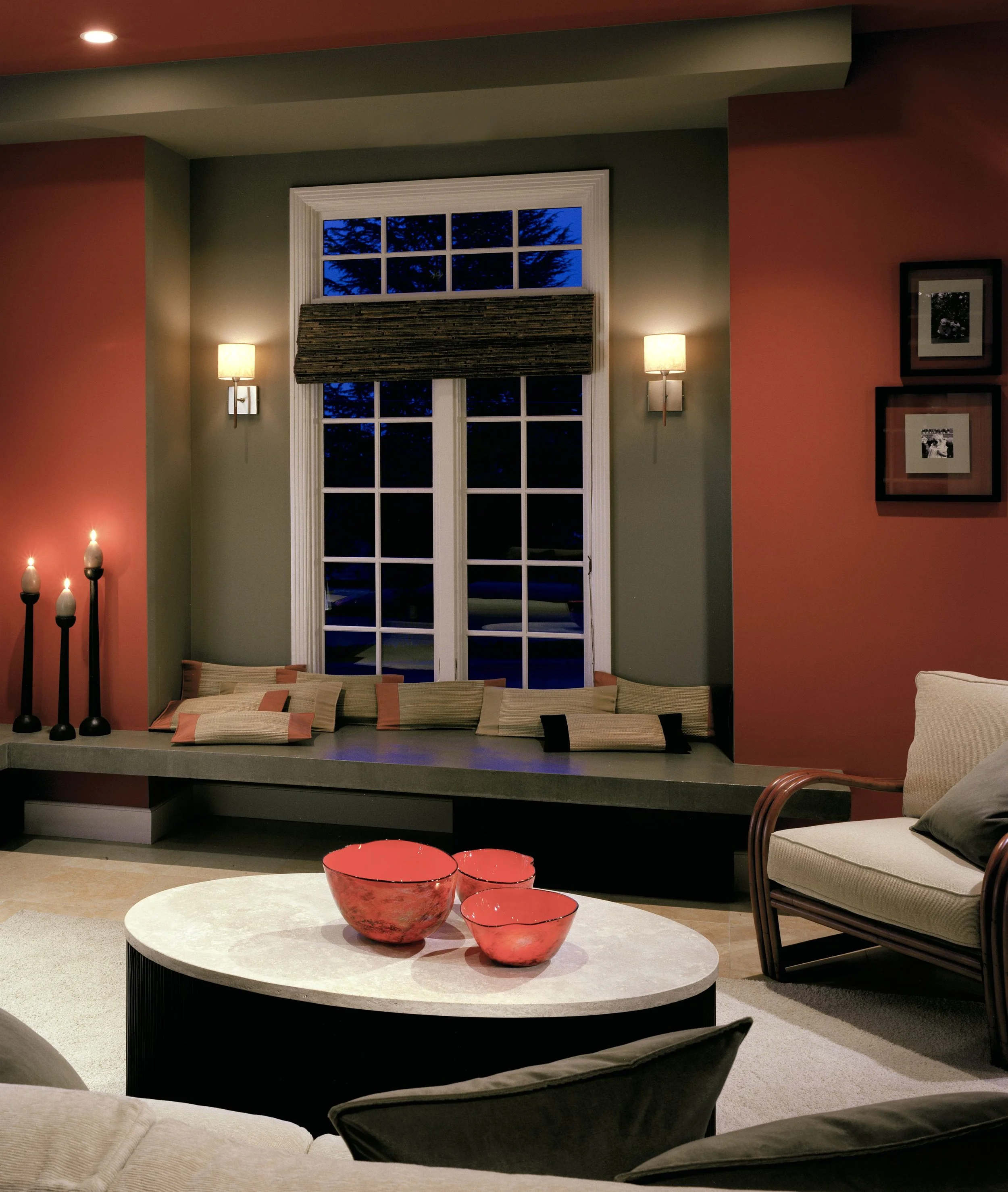 Living room with a large window, cushioned bench underneath, a cream-colored armchair with wooden arms, a coffee table with three decorative red bowls, and black candlesticks with white candles. The walls are painted in green and reddish-brown, with framed black and white photos hanging on the wall.